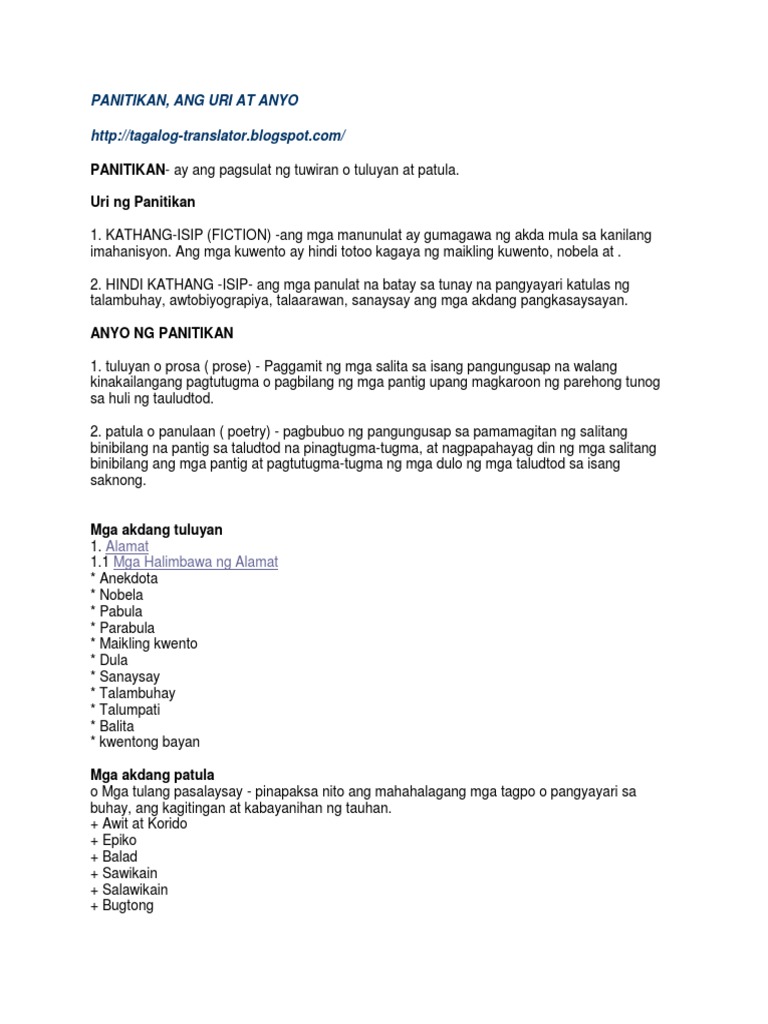 Ang mga uri nito ay pormalistiko o pang-anyo. Anekdota Kinapapalooban ng kakatwang pangyayari sa buhay ng tao na kapupulutan ng aral. Jose Villa Panganiban ay nanggaling sa salitang ugat na TITIK na dinagdagan ng panlaping pang- at -an.