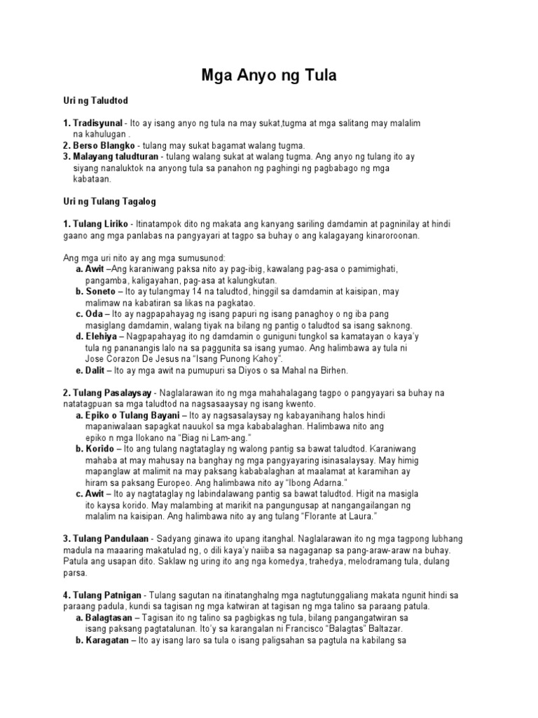 Malayang taludturan - tulang walang sukat at walang tugmaAng anyo ng tulang ito ay siyang nanaluktok na anyong tula sa panahon ng paghingi ng pagbabago ng mga. A native form of poetry. Ang Tula ay isang anyo ng sining o panitikan na naglalayong maipahayag ang damdamin sa malayang pagsusulatBinubuo ang tula ng saknong at taludtodAng tula ay maaaring distinggihin sa tatlo na bahagi.