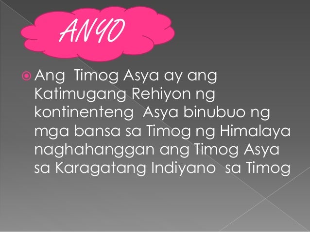 Ang asya ay nagmula sa isang greek word na. Ang Pilipinas ay isa sa itinuturing na mga bansang insular dahil binubuo ito ng libo- libong pulo. At sa Hilagang asya na may Grass land ito ay may tatlong uri.