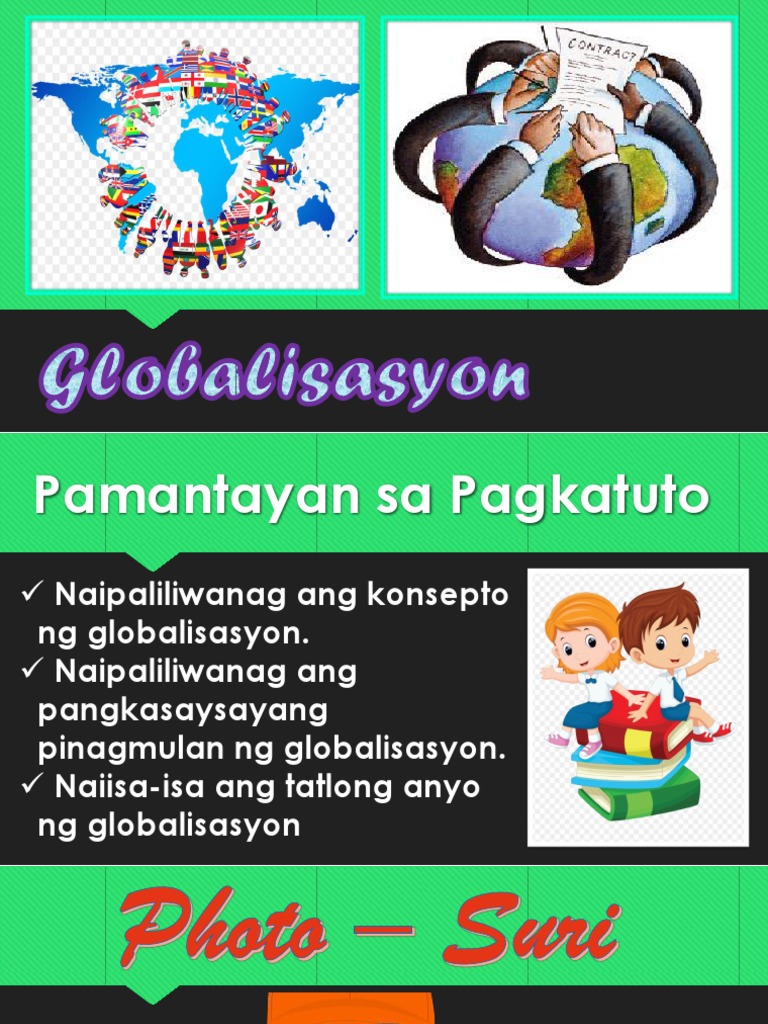 Sa isang agarang kahulugan ang mga uri ng globalizing isyu na haharapin mula samga kahihinatnan ng terorismo kasama ang globalisasyon ng mga giyera laban dito hanggang sa mas nakatagong sistematikong karahasan ng mga kasalukuyang rehimen ng pagka-alipin at indentured labor bilang mga lokal na. View MGA-EPEKTO-NG-GLOBALISASYON-mod-4pptx from ARALING PANLIPUNAN GRADE 10 at Davao City National High School. May tatlong anyouri ang globalisasyon.